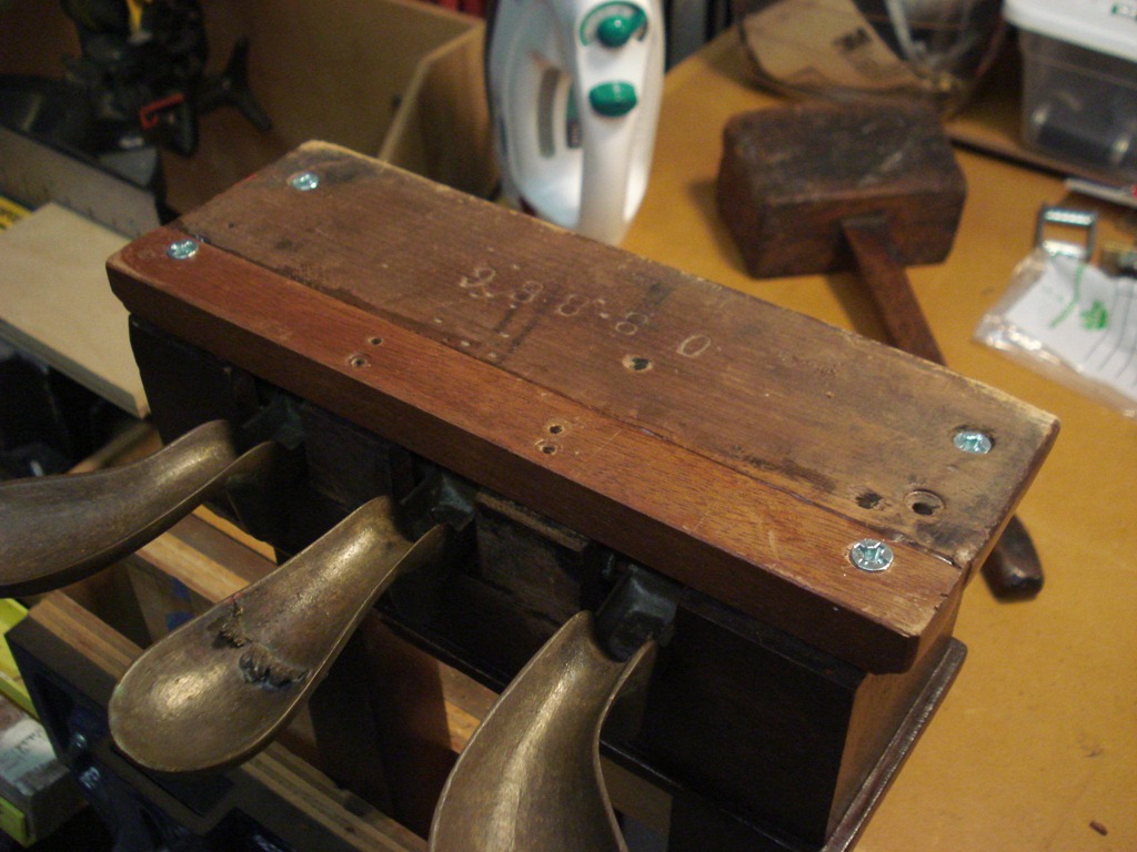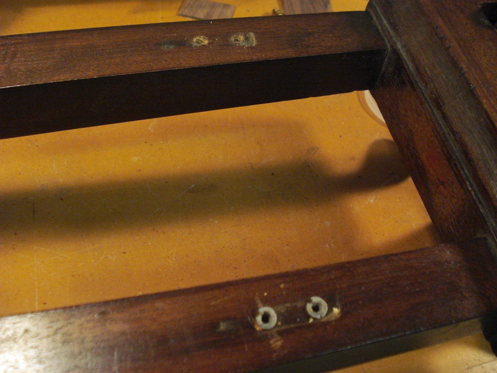 Right Pic – Going to dowel the pedal support holes on the back. Notice the plastic screw expanders in the holes on the near side. Interesting idea, but NO, gonna dowel those holes, then re-drill
