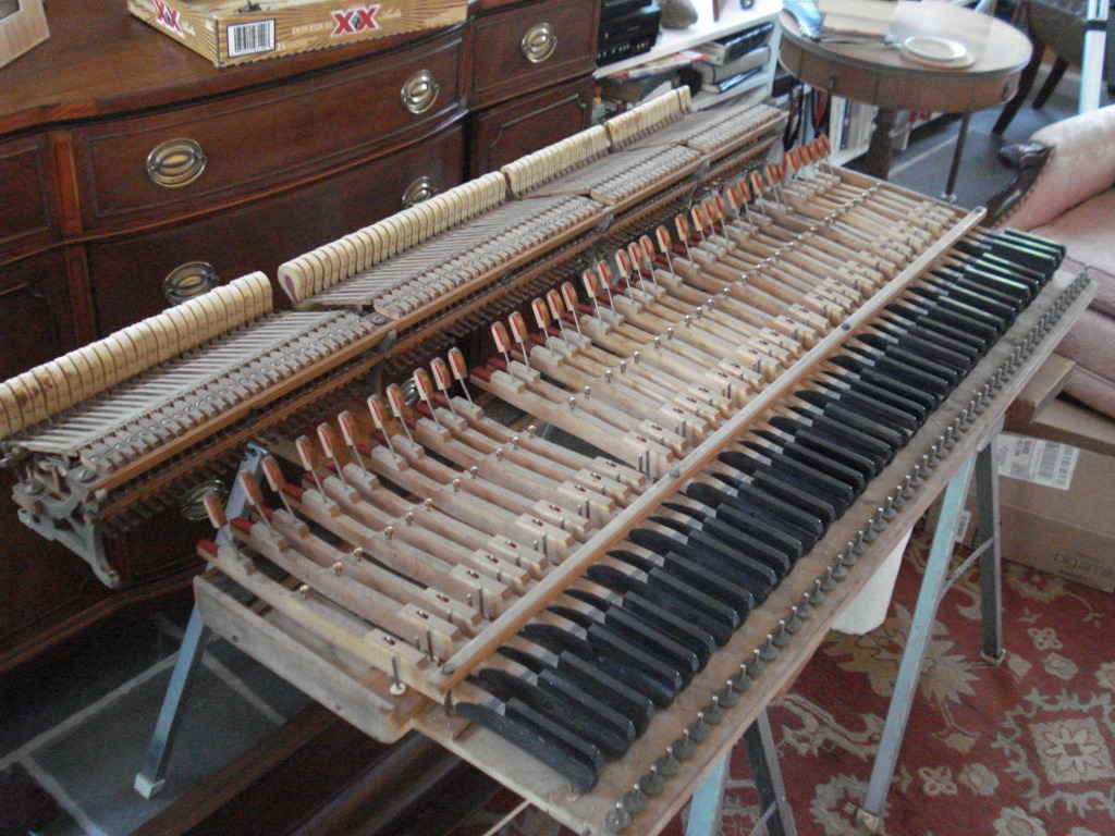 Right Pic – Action installed, everything vacuumed out…ready for the fallboard(key cover), cheek blocks(those blocks at ends of the keyboard), and key slip(long skinny piece that sits in front of the keys)