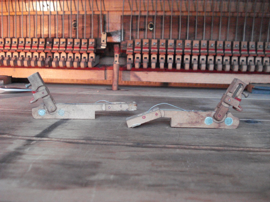 Left Pic – Gluing the 1st flange…as you can see, there’s minimal access to this area…the wood block in the foreground is the right side cheek block(block of wood that normally sits to the right of the highest C key…the metal rod is a screwdriver blade, holding the “glued” section down