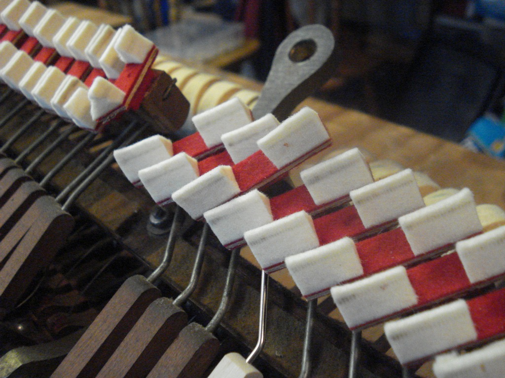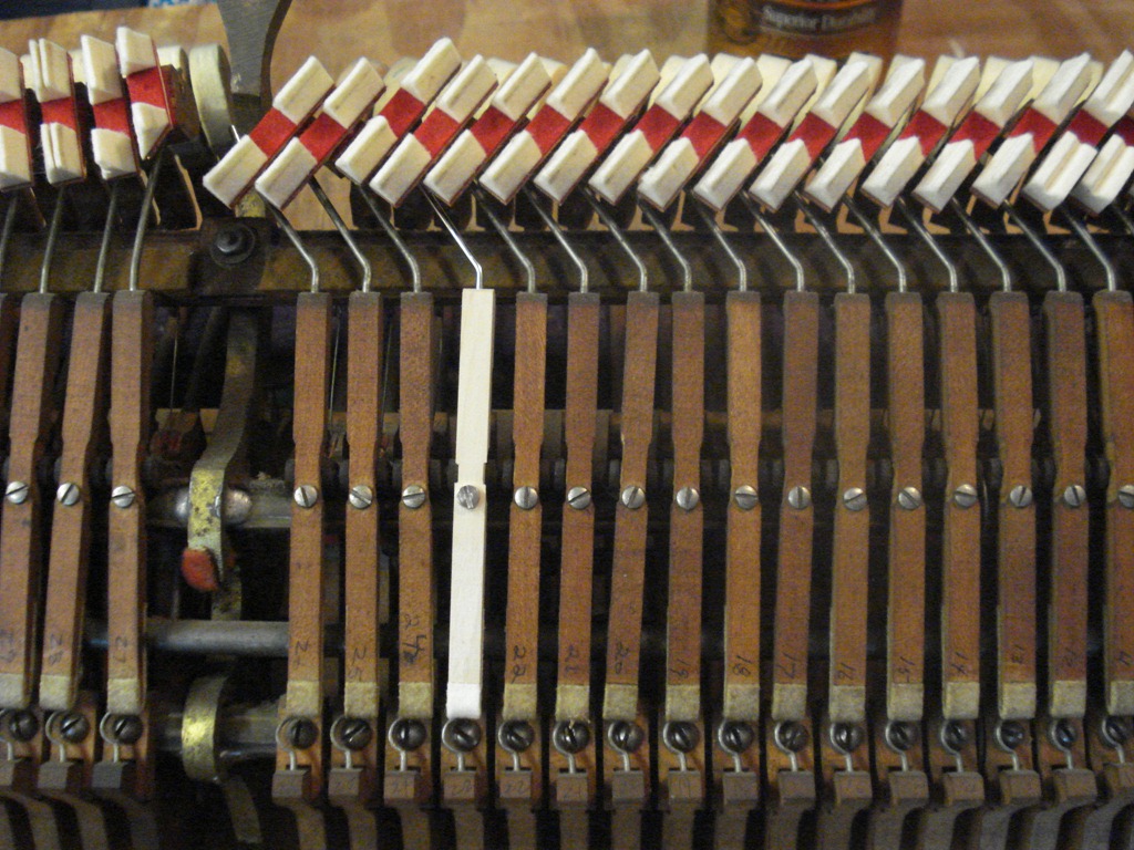 Left Pic – The action needed some significant damper adjustment. I’m using a homemade support jig to hold the action in playing position so I have access to both sides of the action, and don’t have to worry about the action falling over.