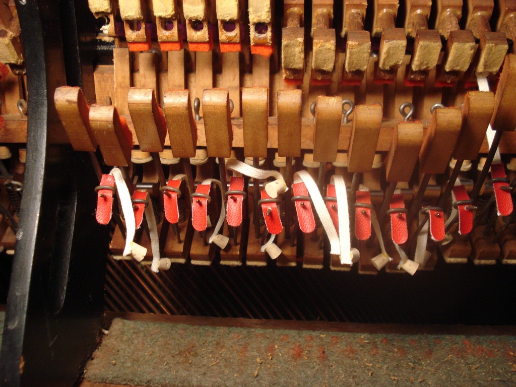 This is an early 1900’s upright, that I’ve been working on for a client. Mice had inhabited the piano for an extended length of time. (See further down the page for the cleanup pics) The mice also ate all of the bridal straps, along with some other things. In the pics below I’m removing the remnants of the old straps and replacing with new ones.